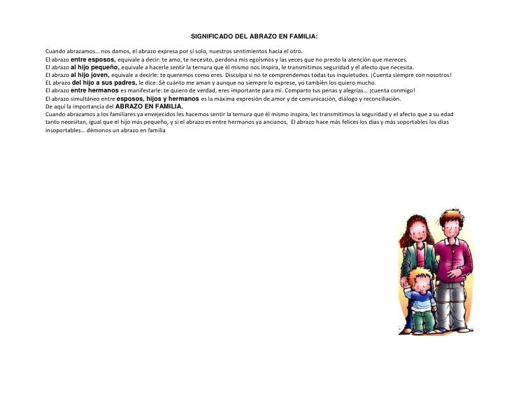 Opinión. "El abrazo en familia" | Primera Edición COL from primeraedicioncolcom.files.wordpress.com El día del abrazo es todos los 21 de enero, en que se conmemora la celebración del día internacional del abrazo, pero puedes aprovechar cualquier momento para abrazar a tus seres queridos. El abrazo en familia, bella bendición, y si tú te animas tambien te lo doy. Abrazo a mis padres y a mis hermanos que no queda nadie sin ese abrazo. Domingo del mes de noviembre. El objetivo de esta campaña era reforzar los lazos afectivos entre los miembros de la familia. ¡venga ese abrazo!… dice alguien que quiere compartir o brindar un sentimiento de satisfacción, de acercamiento, de hoy se conmemora el día internacional del abrazo, una festividad originalmente promovida y puesta en práctica en estados unidos, por kevin. Se eligió esta fecha debido a que tras pasar las navidades con la familia, muchas personas se deprimían al regresar a su vida diaria, en una época en la que los días son cortos, hay menos luz y el clima es frío e inestable. 1991 en el año 1991 se propuso celebrar dicha campaña con el lema:
